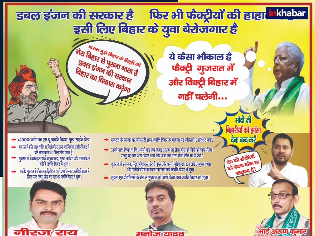 राजद के इस पोस्टर में सीधे तौर पर “डबल इंजन” सरकार की प्रभावशीलता को चुनौती दी गई है, जिसमें दावा किया गया है कि इसकी मौजूदगी के बावजूद, कारखाने संघर्ष कर रहे हैं, और बिहार में युवा बेरोजगार हैं.
