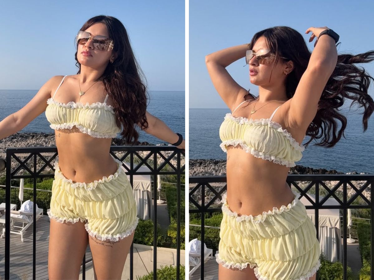 अवनीत कौर ने येलो ब्रालेट और शॉर्ट्स के साथ स्लीपर लुक वाली हील्स कैरी की हैं। इतना ही नहीं, एक्ट्रेस ने अपने बालों को कर्ल किया है और बीच से पार्टिशन करके ओपन छोड़ा है। अवनीत ने लुक पूरा करने के लिए बड़े-बड़े गॉगल्स भी पहने हैं।
