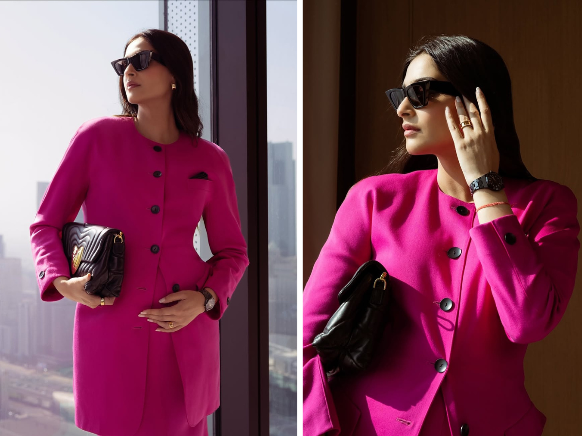 फोटोज में सोनम कपूर ने स्टाइलिश पिंक कलर की ड्रेस पहनी है, जिसमें नी-लेंथ की स्कर्ट और लॉन्ग ब्लेजर है. एक्ट्रेस ने ब्लैक कलर की स्टाकिंग्स और बेली हील्स भी कैरी की हैं. सोनम ने अपना लुक ब्लैक गॉगल्स के साथ पूरा किया है और वह किसी फोटो में शीशे की वॉल के सहारे खड़े अपने बेबी बंप पर हाथ रखकर कैमरा के लिए पोज कर रही हैं और किसी में वह सोफे पर बैठकर स्टाइल दिखा रही हैं. बता दें, फोटोज के साथ एक्ट्रेस ने कैप्शन में मां लिखा है और Kiss वाला इमोजी लगाया है.