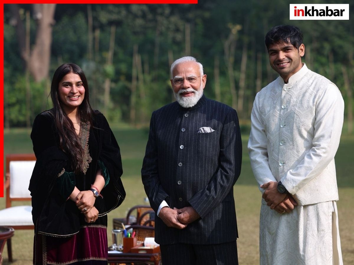 PM Modi Meets Neeraj Chopra-Himani Mor: प्रधानमंत्री नरेंद्र मोदी ने मंगलवार को स्टार जैवलिन थ्रोअर नीरज चोपड़ा और उनकी पत्नी हिमानी मोर से मुलाकात की. यह मुलाकात प्रधानमंत्री आवास यानी 7 लोक कल्याण मार्ग पर हुई. इसकी जानकारी पीएम मोदी ने सोशल मीडिया प्लेटफॉर्म ‘एक्स’ पर तस्वीर शेयर कर दी. इसके बाद नीरज चोपड़ा ने भी मुलाकात को लेकर धन्यवाद कहा.