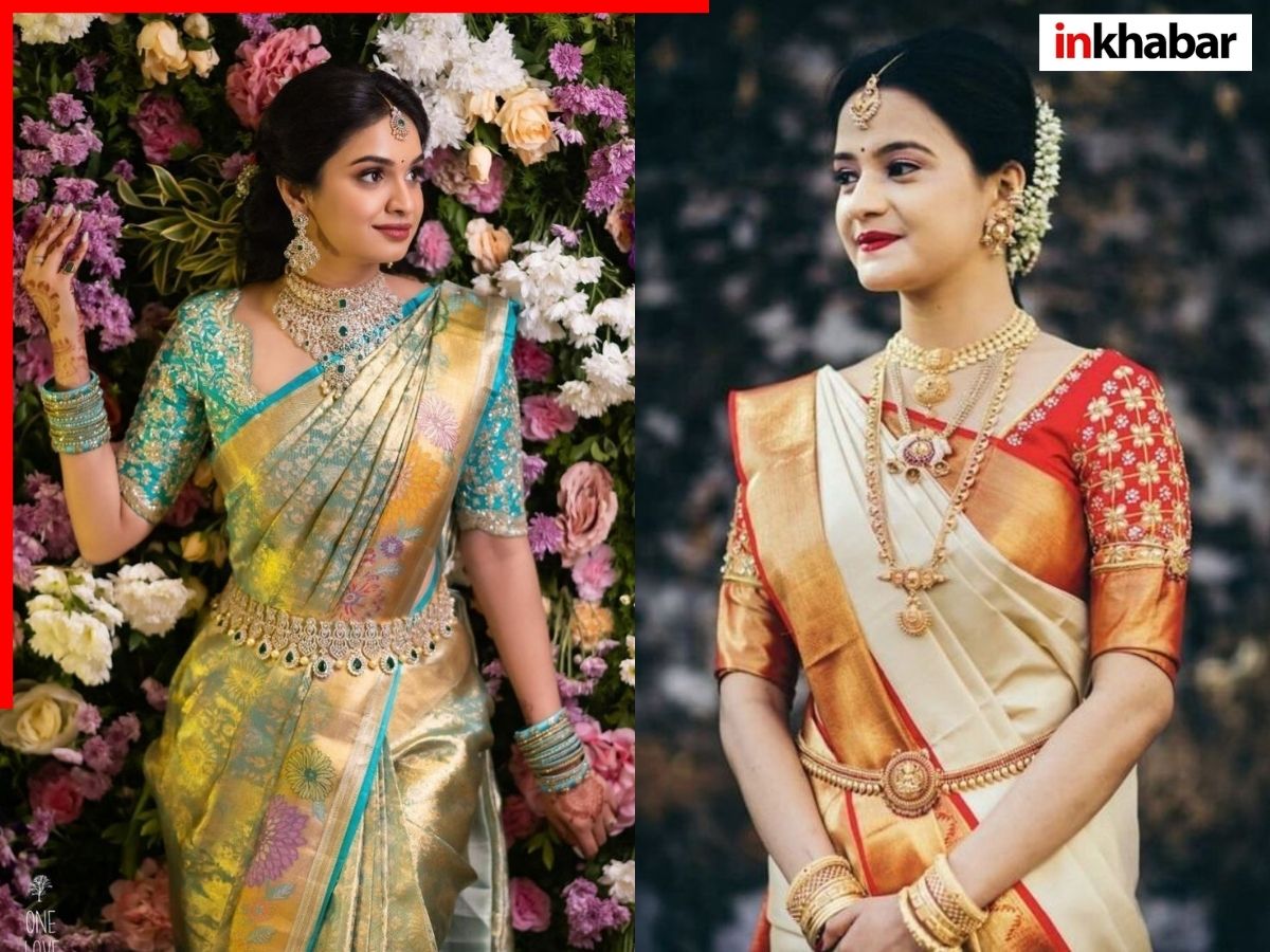 गहने: दक्षिण भारतीय साड़ी के साथ ‘टेंपल ज्वेलरी’ या सोने के भारी गहने सबसे सुंदर लगते हैं. एक शानदार हार, झुमके, चूड़ियां और कमरबंद (Kamarbandh) इस लुक को पूर्णता देते हैं.