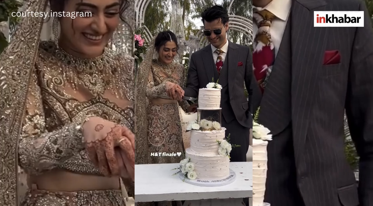 सोशल मीडिया पर कृति सनन की बहन नूपुर सनन के बाद अब पाकिस्तान के एक्टर्स हिना अफरीदी और तैमूर अकबर की शादी छाई हुई है, लोगों को दोनों की जोड़ी बेहद ही पसंद आ रही है, हिना के बारात के लुक के बाद उनका वलीमा लुक इस वक्त हर एक के दिल पर छा गया है, एक्ट्रेस अपने यूनिक लेहेंगे में किसी परी से कम नहीं लग रही थीं, साथ ही तैमूर ने भी अपने हैंडसम लुक से लड़कियों को दीवाना बना रखा है.