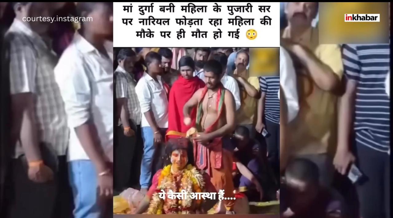 Viral Video: हाल ही में एक वीडियो सामने आई है जिसे देखते ही सबके रौंगटे खड़े हो गए, एक धार्मिक अनुष्ठान के दौरान ‘मां दुर्गा’ का रूप धारण किए महिला की मौत ने सनसनी फैला दी है, यह चौंकाने वाली घटना तब हुई जब एक पुजारी ने पूजा विधि के तहत महिला के सर पर नारियल फोड़ा, आरोप है कि कुछ नारियल फोड़ने के बाद महिला की मौके पर ही मृत्यु हो गई.