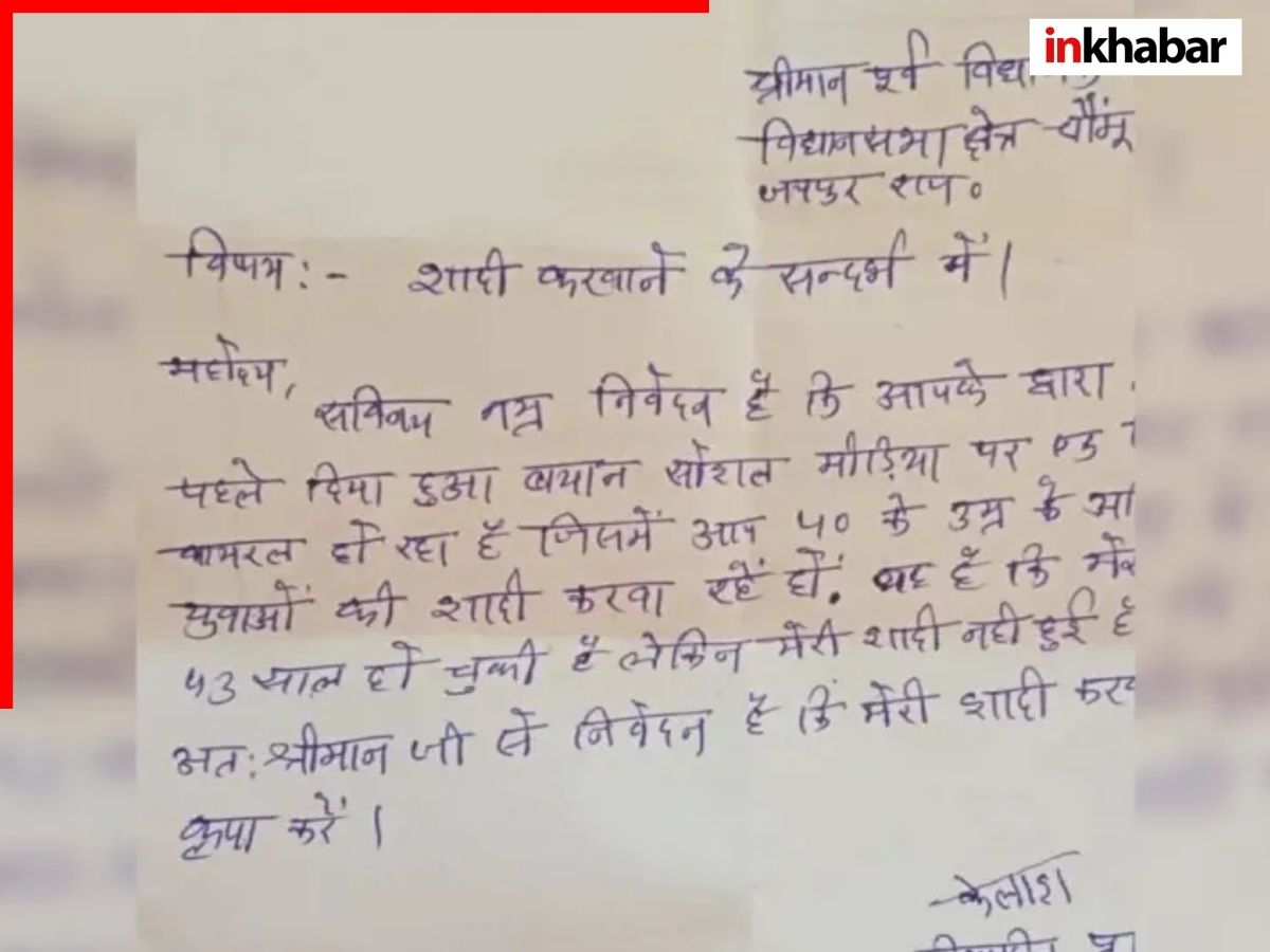 दरअसल, चीथवाड़ी गांव के रहने वाले 43 साल के अविवाहित युवक कैलाश शर्मा ने पूर्व विधायक से शादी कराने की खास अपील की है. उन्होंने पत्र में लिखा कि जीवन में कई बार शादी के लिए कोशिश की लेकिन किसी कारणवश उनकी शादी नहीं हो सकी. साथ ही उन्होंने पत्र में आगे लिखा कि उम्र बढ़ने के साथ-साथ वह समाज में एक मजाक का विषय बनकर रह गए हैं. हर कोई उनका मजाक बनाता है.