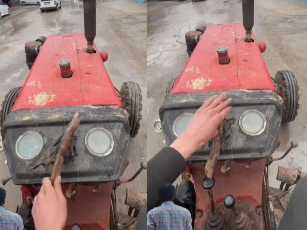 इस क्लिप में देखा जा सकता है कि ट्रैक्टर का स्टीयरिंग टूट गया है और ट्रैक्टर को चलाने के लिए शख्स ने लकड़ी का सहारा लिया है.