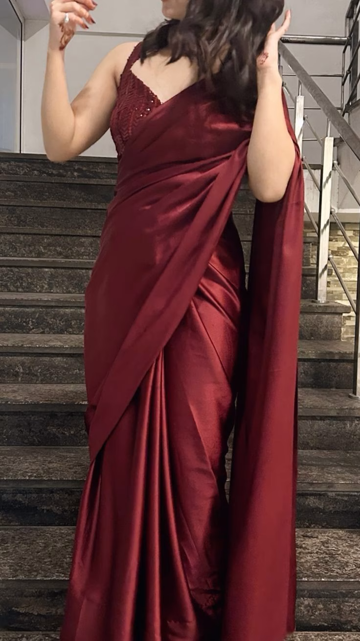 रेड साड़ी के साथ गहरे मैरून ब्लाउज का कॉम्बिनेशन एलिगेंट और क्लासिक लुक देता है।