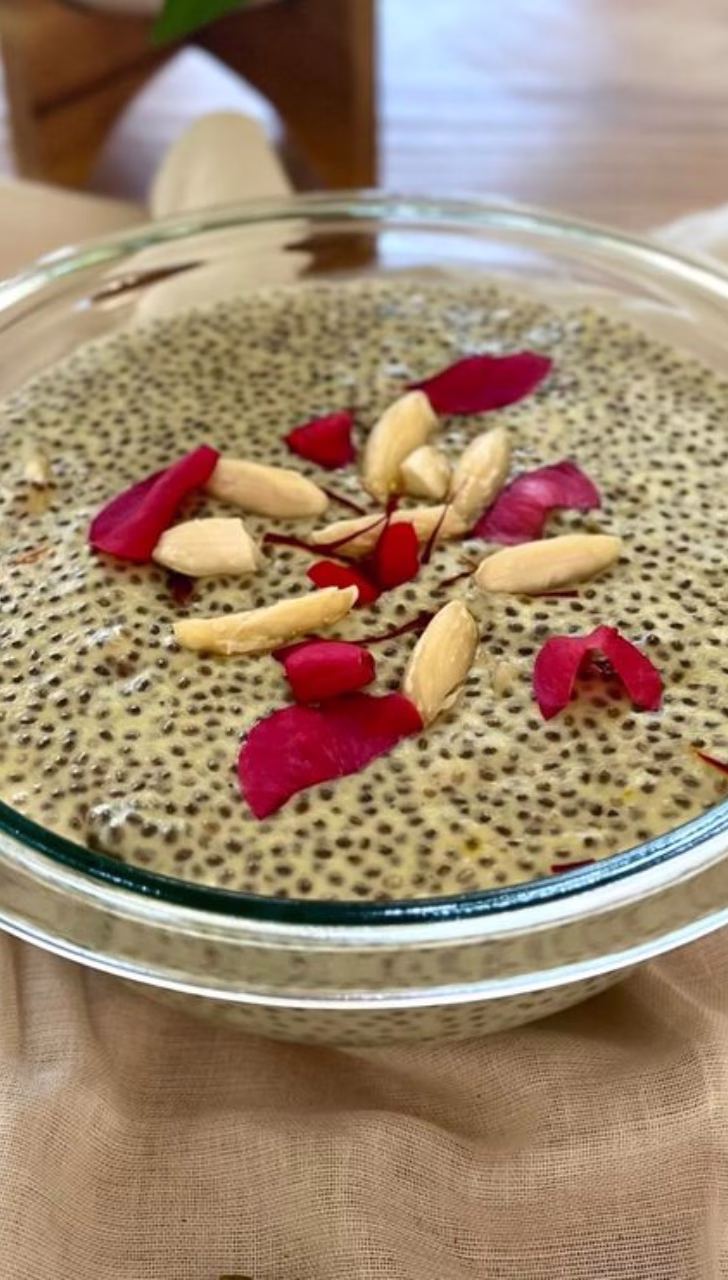 अब ऊपर से गुलाब की पंखुड़ियों और पिस्ता से गार्निश करके ठंडा या हल्का गुनगुना चिया सीड्स की खीर सर्व करें.