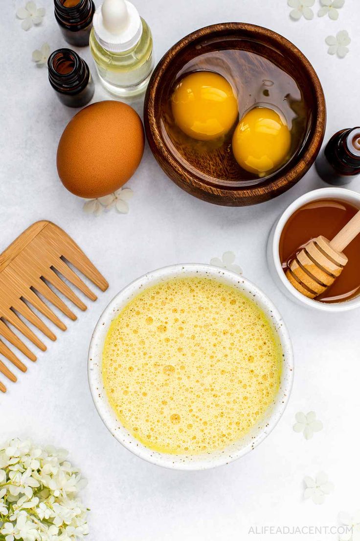 अंडा प्रोटीन से भरपूर होता है जो बालों की जड़ों को मजबूत बनाता है। एक अंडे में एक चम्मच जैतून का तेल और एक चम्मच शहद मिलाकर पेस्ट बना लें।