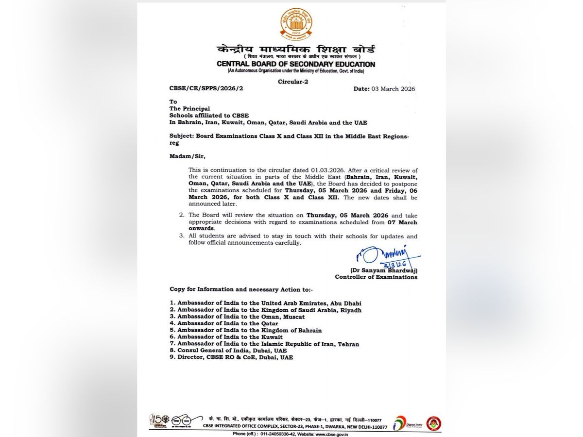 सीबीएसई ने बहरीन, ईरान, कुवैत, ओमान, कतर, सऊदी अरब और संयुक्त अरब अमीरात में स्थित अपने संबद्ध विद्यालयों के प्राचार्यों को आधिकारिक सूचना भेजी है. इसमें कहा गया है कि 5 और 6 मार्च को होने वाली परीक्षाएं अब निर्धारित तिथियों पर आयोजित नहीं होंगी. नई परीक्षा तिथियों की घोषणा बाद में की जाएगी. बोर्ड ने ये भी बताया कि 5 मार्च को क्षेत्र की स्थिति की दोबारा समीक्षा की जाएगी और 7 मार्च से निर्धारित परीक्षाओं के संबंध में उपयुक्त फैसला लिया जाएगा.